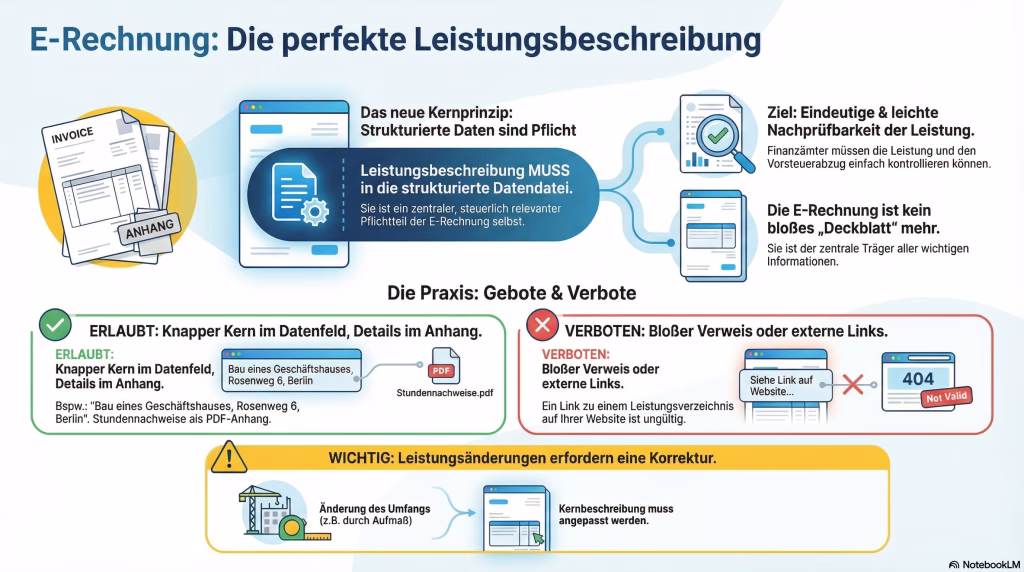 - Kernangaben zur Leistung (Art, Umfang, Ort, Steuersatz) müssen im strukturierten Teil enthalten sein.